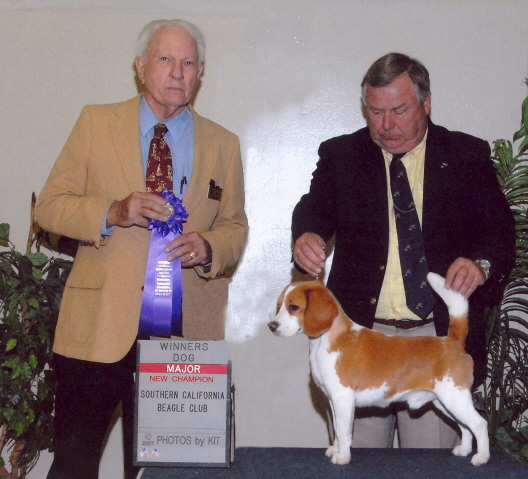 CH Red Dog, also called “R.D.” is a well marked red & white 13″ Beagle. He finished his championship quickly and is pictured winning Winner’s Dog at the Southern California Beagle Club’s Specialty show on January 26, 2007.